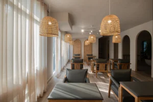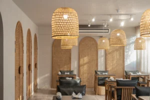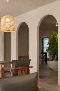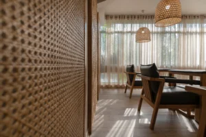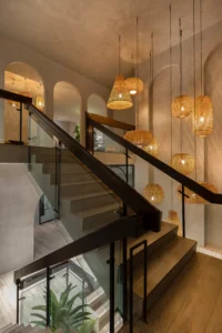 Local materials such as wood and rattan, crafted by regional artisans, introduce warmth and authenticity. Textures, open spaces, and delicately designed arches create a harmonious blend of ethnic charm and modern sensibility.