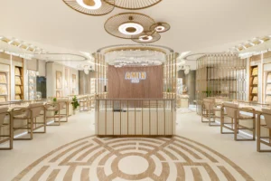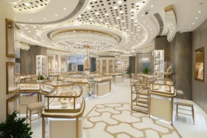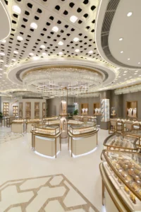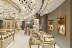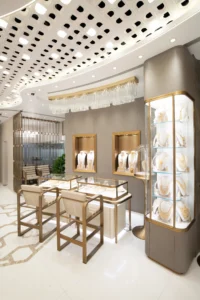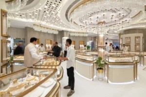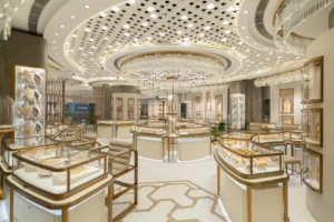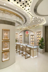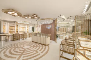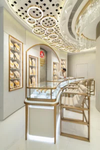 Located within one of Dhaka’s most opulent shopping destinations, the design challenge was to create a distinctive identity amid the mall’s heavily gilded and ornamental interior. The design team responded with a soft beige and gold palette, balanced by white marble flooring and ceilings to establish a lighter, more sophisticated visual tone. This neutral yet elegant base enhances illumination and ensures the jewellery remains the true focal point of the interior.